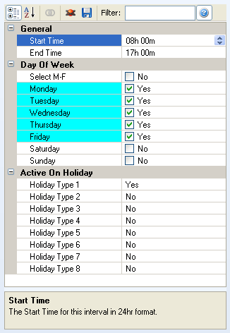 Clicking in a cell in the right column of the grid enables editing options for that cell as shown in the Start Time cell above. When you click in a cell, the bottom field in the grid provides a brief description of the purpose of that cell.