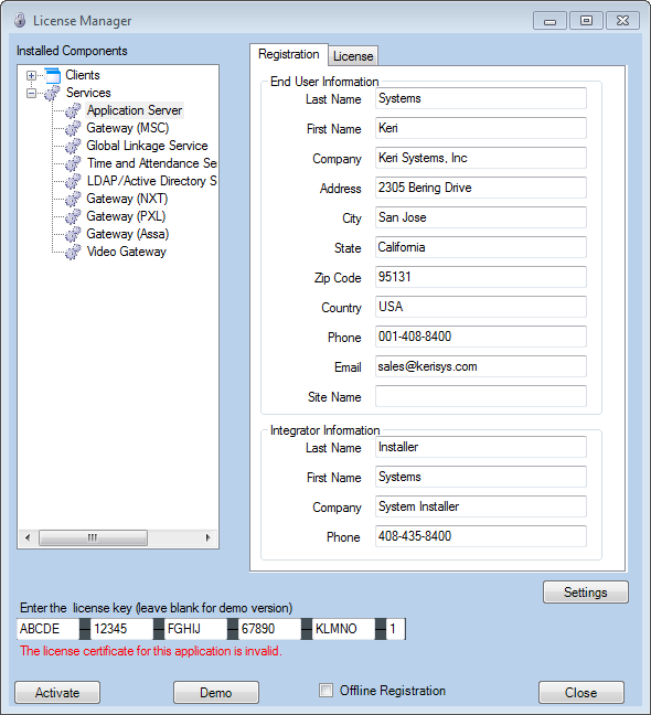 The license key can be activated over the internet (the quickest and easiest method) , via e-mail (you send in your license key to Keri, we activate it for you then e-mail it back). Or you can activate the software in demo mode (which does not require you to have an internet connection). Demo mode allows you to evaluate the software with limited and basic operation. Demo mode is activated for 30 days.