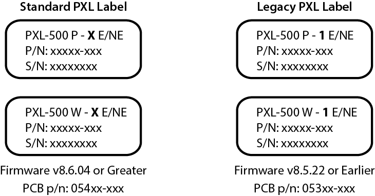 The PXL controller’s model number label identifies if the controller is Standard or Legacy (refer to the figure below). Standard controllers work directly with Doors.NET using a standard license. There is no controller limit when using Standard controllers.