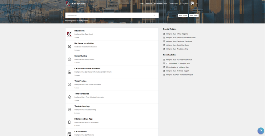 The technical support section contains basic setup information for the Intelliprox Blue app and links to Keri Systems corporate website and knowledge base (where you can locate technical and marketing material related to all Keri Systems products). You will also find links to Twitter and YouTube accounts and technical support contact information.