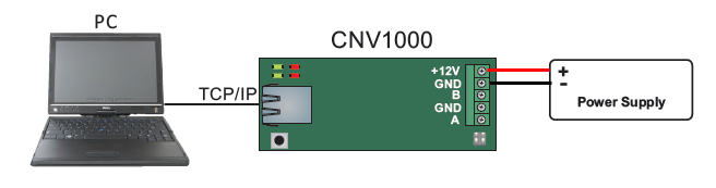 The CNV-1000 converter is connected to the PC via a local area network (into a network hub or switch) or directly from the host PC (using a cross-over cable). It uses an external 12VDC power supply and does not require any drivers to be installed.