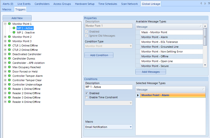 The Global Linkage Module and related user interface screens provide a means of automating system functions, features and notifications system-wide. The configuration of the Global Linkage Module consists of two parts; the Global Macro (what you want to happen) and the Global Trigger (when do you want the Macro to execute) along with the source of the Global Trigger.