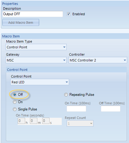 - Repeat the previous process to create a second Macro and rename it (Red LED Inactive). The Macro item type will be Output OFF. Select the same Control Point again but this time set it to Off.
