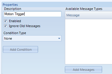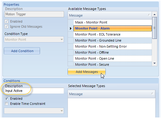 - Click the new condition to highlight it and give the condition a description (Input Active). From Available Message Types click Monitor Point - Alarm then click the Add Messages button.