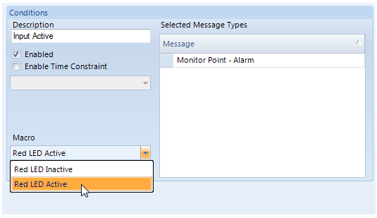 - Click Add Condition again. The Monitor Point - Secure condition can be assigned to the same trigger but will action the second Macro (to de-activate the Red LED output).