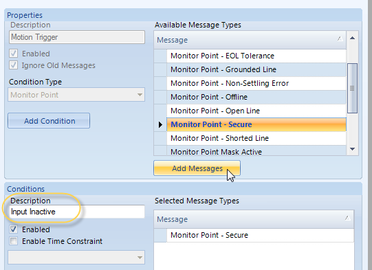 - Highlight the second condition and give it a description (i.e Input Inactive). From the Available Message Types select Monitor Point - Secure, then click the Add Messages button.