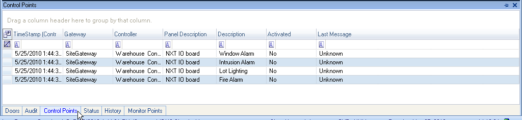 The Control Points status window displays the status of all configured control points. Click on the Control Points tab at the bottom of the program window to display this information. Each column can be sorted or grouped to quickly find a specific item.