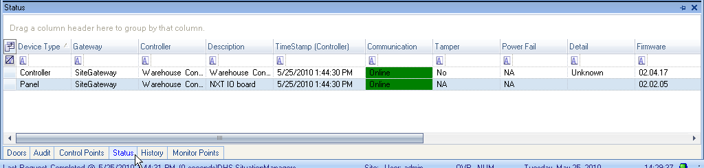 The Controller Status window displays the status of all recognized controllers. Click on the Status tab at the bottom of the program window to display this information. Each column can be sorted or grouped to quickly find a specific item.