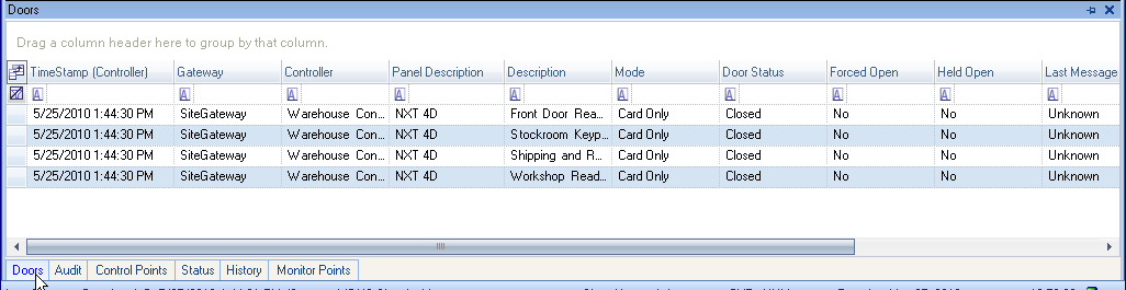 The Doors status window displays the status of all configured doors. Click on the Doors tab at the bottom of the program window to display this information. Each column can be sorted or grouped to quickly find a specific item.
