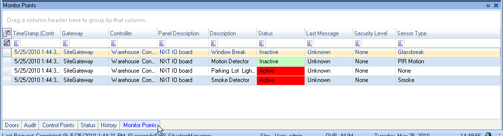 The Monitor Points status window displays the status of all configured monitor points. Click on the Monitor Points tab at the bottom of the program window to display this information. Each column can be sorted or grouped to quickly find a specific item.