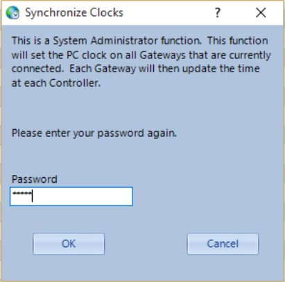 The synchronization command sets the clock in all gateways and controllers to the time set in the system PC. This command requires a System Administrator password for execution. After authentication, the following actions occur: